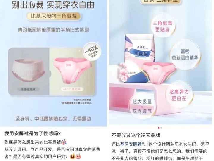 近日,知名卫生巾品牌ABC的一款“丝滑比基尼经期裤”引起争议,网传图片显示,“ABC丝滑比基尼隐形经期裤”宣称舒适不勒,富含蚕丝蛋白精华。此外,品牌方宣传其为ABC品牌首款三角裁剪卫生裤,告别纸尿裤般厚重的平角旧式裤型,“拥抱新舒适主义”“别出心裁”“实现穿衣自由”。
