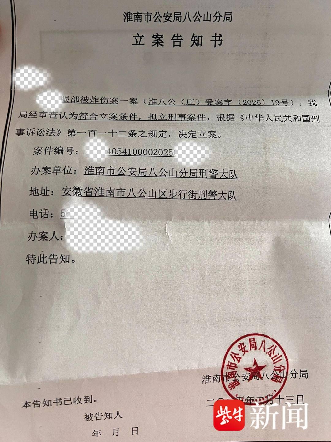 根据小王提供的淮南市公安局八公山分局出具的立案告知书显示,其眼部被炸伤一案,经审查符合立案条件,拟立刑事案件。小王告诉扬子晚报/紫牛新闻记者,目前自己还没有做伤情鉴定,“需要等警方通知的时候再去做。”