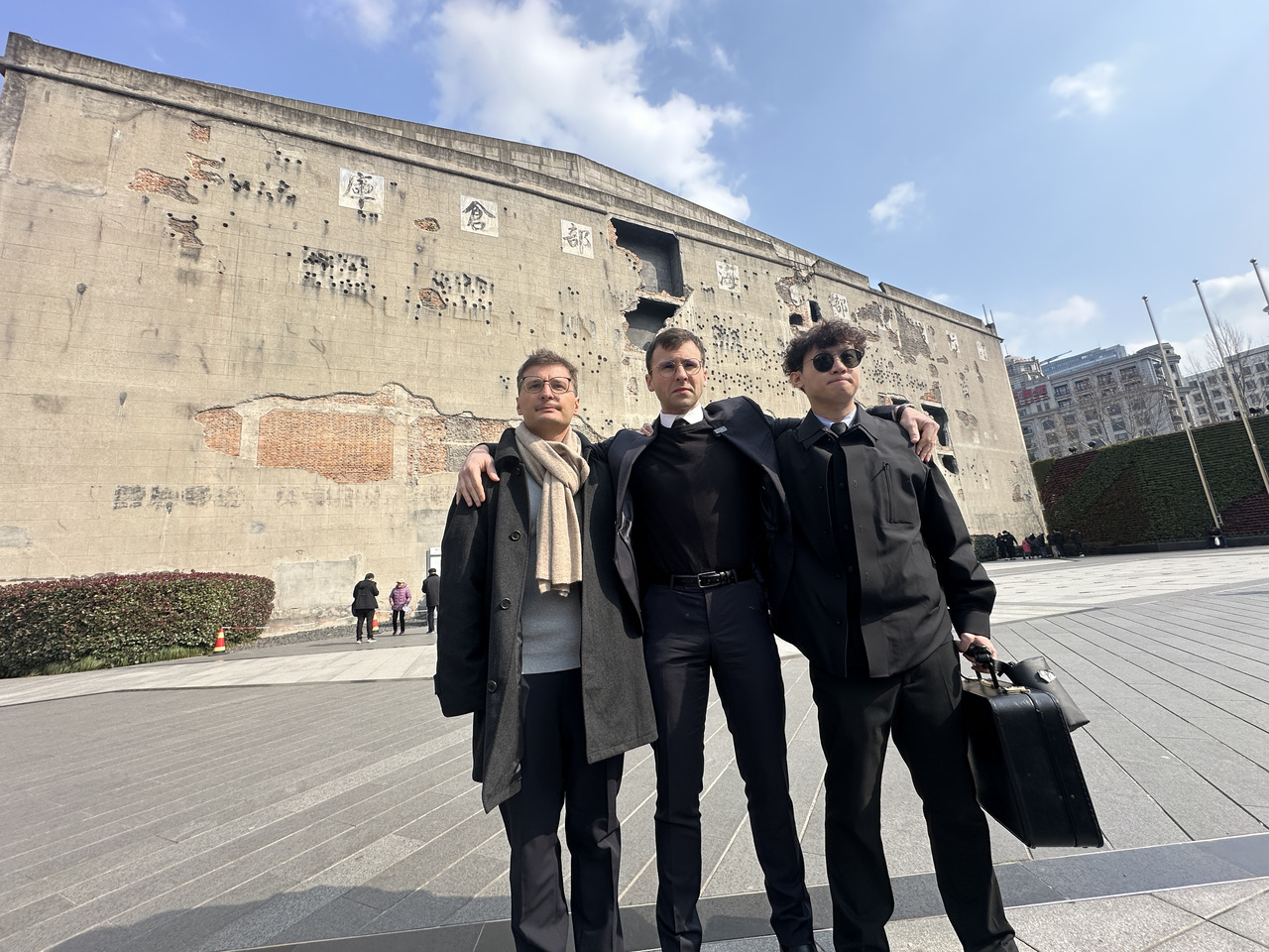 马库斯(中)及其同行朋友松松(左一)、士杰(右一)来到上海四行仓库处合影 潮新闻记者 王嘉楠 摄