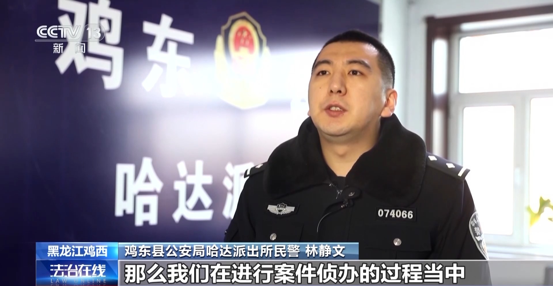 鸡东县公安局哈达派出所民警 林静文:犯罪嫌疑人曾跟她进行短暂的视频对话,她看到犯罪嫌疑人身着警服、佩戴警号、戴着警帽,上面有警徽。