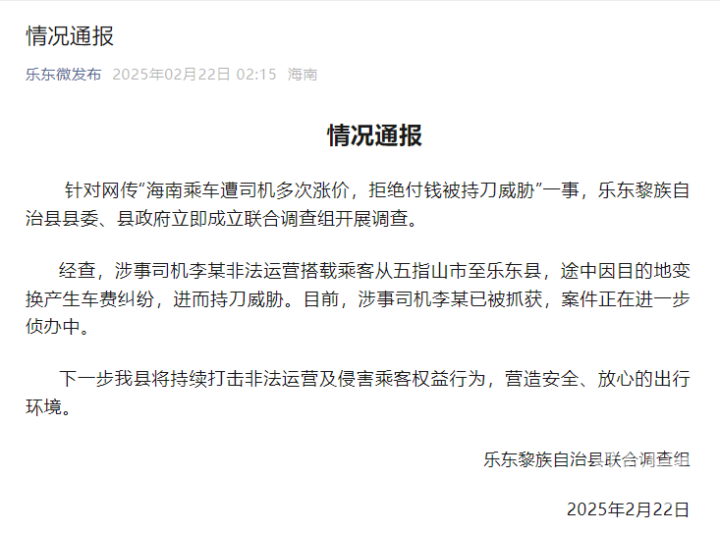 针对网传“海南乘车遭司机多次涨价,拒绝付钱被持刀威胁”一事,乐东黎族自治县县委、县政府立即成立联合调查组开展调查。