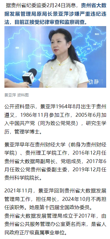 都市快报综合报道 据贵州省纪委监委2月24日消息,贵州省大数据发展管理局原局长景亚萍涉嫌严重违纪违法,目前正接受纪律审查和监察调查。