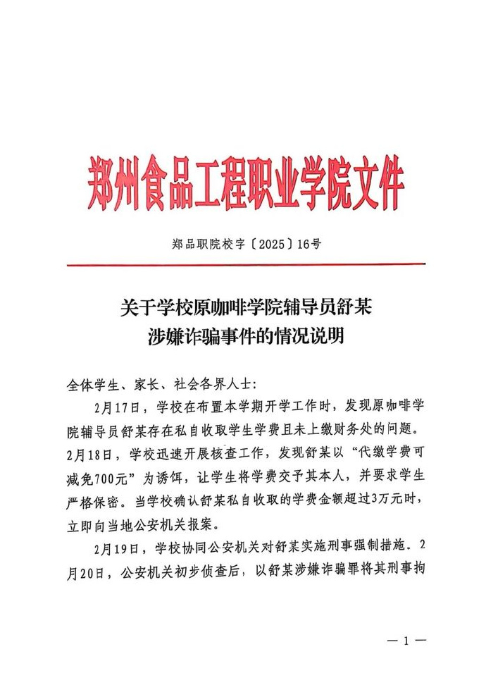 郑州食品工程职业学院官微2月26日凌晨发布《关于原咖啡学院辅导员舒某涉嫌诈骗事件的情况说明》。情况说明称,2月17日,学校在布置本学期开学工作时,发现原咖啡学院辅导员舒某存在私自收取学生学费且未上缴财务处的问题。2月18日,学校迅速开展核查工作,发现舒某以“代缴学费可减免700元”为诱饵,让学生将学费交予其本人,并要求学生严格保密。当学校确认舒某私自收取的学费金额超过3万元时,立即向当地公安机关报案。2月19日,学校协同公安机关对舒某实施刑事强制措施。2月20日,公安机关初步侦查后,以舒某涉嫌诈骗罪将其刑事拘留。目前,该案件正处于刑事侦查程序中。学校已解除与舒某的聘用合同,并对其予以辞退处理。