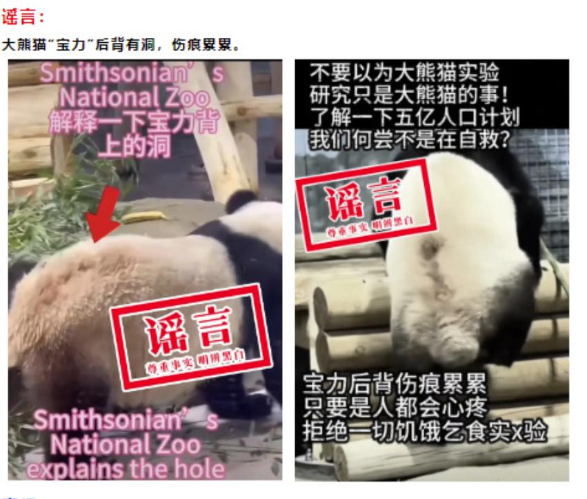 中国新闻网讯 中国大熊猫保护研究中心发布辟谣:“大熊猫‘宝力’后背有洞,伤痕累累”系谣言!经核实,大熊猫“宝力”背部下方毛发因坐着吃东西压覆而形成凹凸状况,并非网传的“洞”。目前,大熊猫“宝力”和“青宝”食欲正常,健康状况良好。