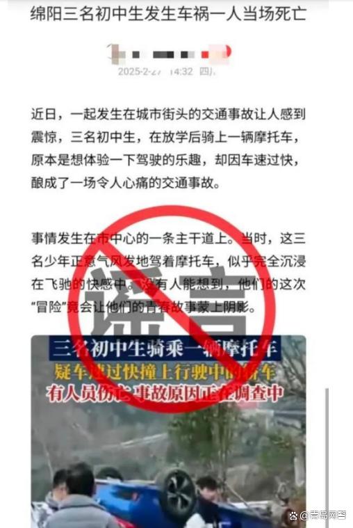 青岛网警消息 近日,一篇标题为《绵阳三名初中生发生车祸一人当场死亡》的帖文在网上传播,引发广大网友关注。