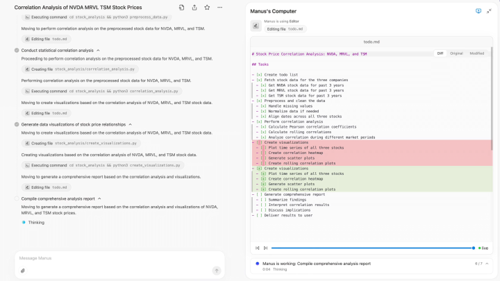 Manus呈现出来的操作,与一个人类股票经纪人十分相似。它先通过API访问雅虎金融等信息网站获取股票历史数据,然后进行交叉验证数据准确程度,避免被单一信息来源误导,对最终产生结果带来重大影响。