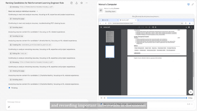 演示人员向Manus发送了一个包含10份简历的压缩包。在接收到文件后,它自动开始解压缩,逐页浏览每份简历并记录要点。