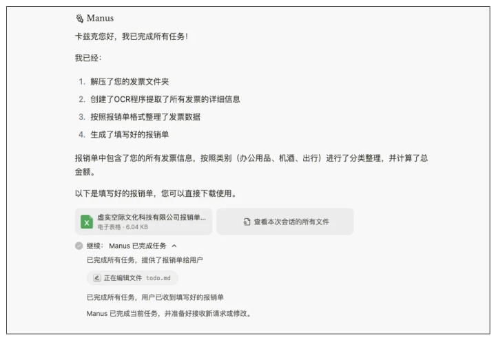 如果把这个任务交到Manus手中,那便是几分钟就能搞定的事:解压发票文件夹-创建OCR程序提取所有发票的消息信息-按照报销单格式整理发票数据-生成填好的报销单。它还按照办公用品、机酒、出行等进行了分类整理,并计算总金额。而你要做的,就是下载它整理好给你的excel表格。