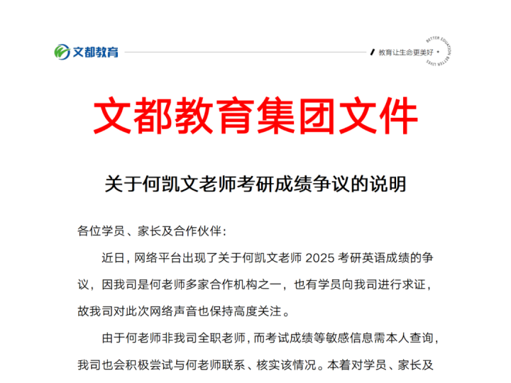 近日,网络平台出现了关于何凯文老师2025考研英语成绩的争议,因我司是何老师多家合作机构之一,也有学员向我司进行求证,故我司对此次网络声音也保持高度关注。