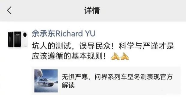 去年年底,懂车帝冬测惹争议。余承东在微信朋友圈就问界 m7参与《2023 懂车帝冬测》的测试结果进行表态:坑人的测试,误导民众!科学与严谨才是应该遵循的基本规则!吉利、长城也纷纷表态,质疑测试结果。