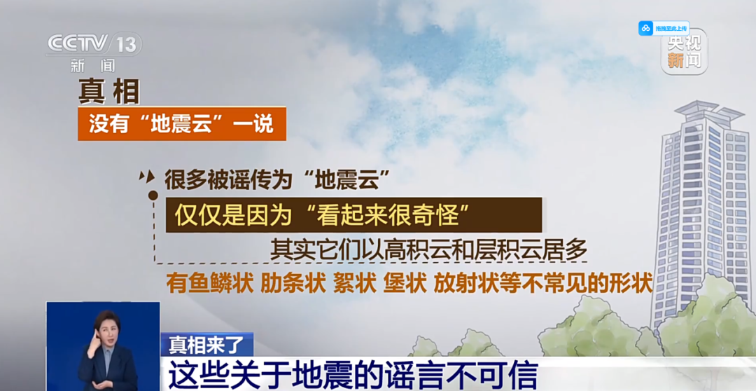 真相:没有“地震云”一说。很多云彩被谣传为“地震云”,仅仅是因为“看起来很奇怪”。其实它们大多是高积云和层积云,有鱼鳞状、肋条状、絮状、堡状、放射状等不常见的形状。云与地震没有直接关联,而气象部门也不会预报并不存在的“地震云”。