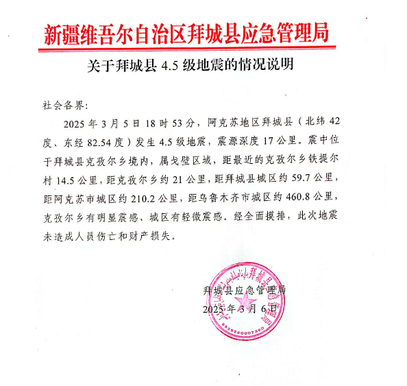 3月6日,拜城县应急管理局发布辟谣声明:经全面摸排,此次地震未造成人员伤亡和财产损失。