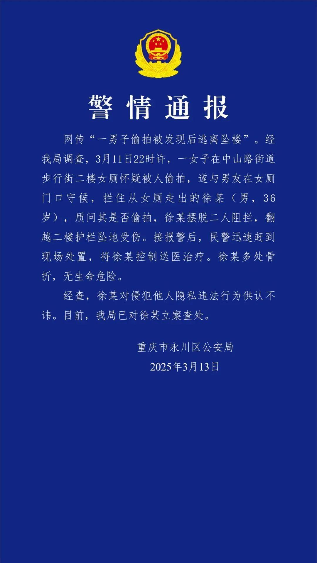 网传“一男子偷拍被发现后逃离坠楼”。经调查,3月11日22时许,一女子在中山路街道步行街二楼女厕怀疑被人偷拍,遂与男友在女厕门口守候,拦住从女厕走出的徐某(男,36岁),质问其是否偷拍,徐某摆脱二人阻拦,翻越二楼护栏坠地受伤。接报警后,民警迅速赶到现场处置,将徐某控制送医治疗。徐某多处骨折,无生命危险。经查,徐某对侵犯他人隐私违法行为供认不讳。目前,警方已对徐某立案查处。