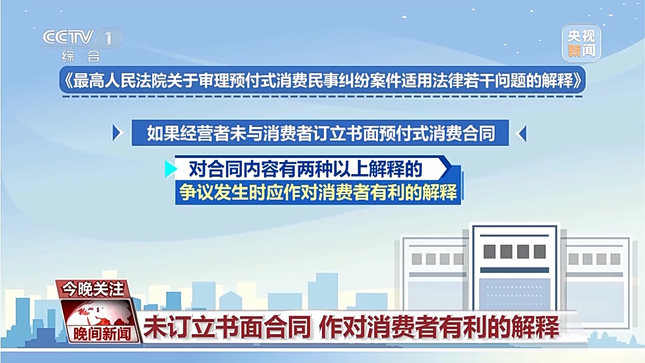 司法解释规定:如果经营者未与消费者订立书面预付式消费合同,对合同内容有两种以上解释的,争议发生时,应作对消费者有利的解释。此外,司法解释还规定了经营者提供证据的责任。