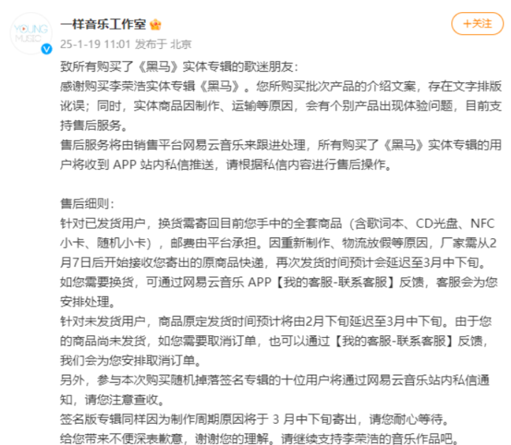1月19日,一样音乐工作室(李荣浩工作室)发文致歉并公布详细售后方案: