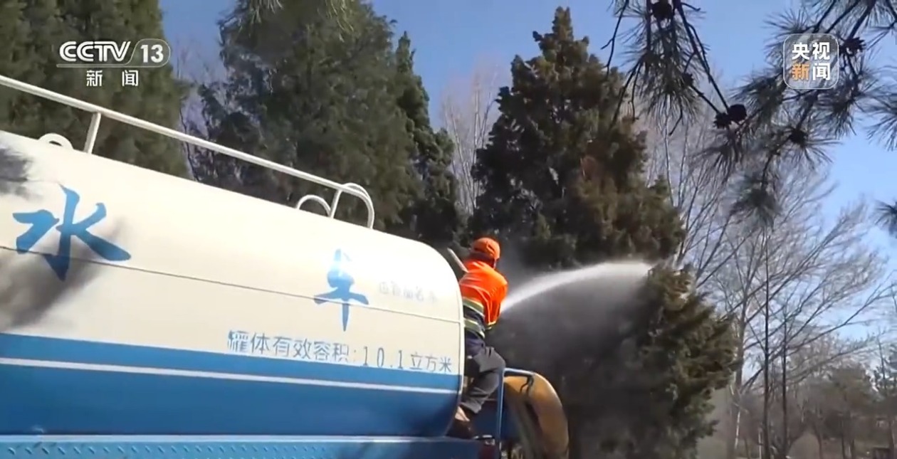 花粉爆发下,天坛公园里的花粉“捕手”也开始行动,他们主要捕获方式是喷水枪,靠水珠“逮捕”四处飞扬的花粉。