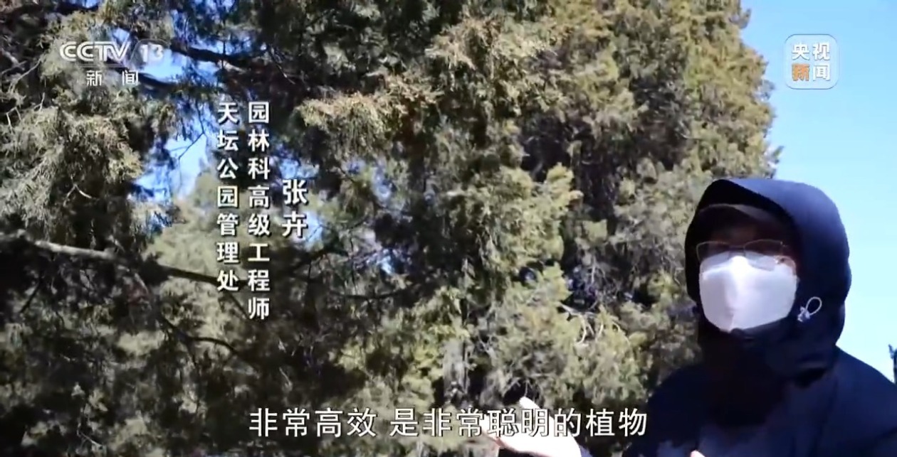 天坛公园管理处园林科高级工程师 张卉:圆柏树有一个特性,光照到的部分生长得很好,光照不到的地方自己就减了,减叶子、减枝条,里边是没有绿叶的,然后它的花、叶都长在外边这一层,非常高效,是非常聪明的植物。