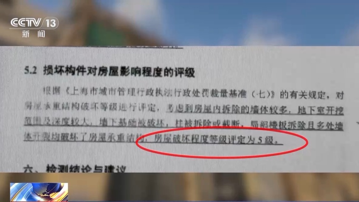 上海市虹口区人民检察院第二检察部主任 黄春笑:这个房子的承重结构有多处被破坏,包括房屋开挖的地下室达到了2.8米深。在专业检测机构房屋评定等级风险等级评定上,达到了破坏的最高等级5级。