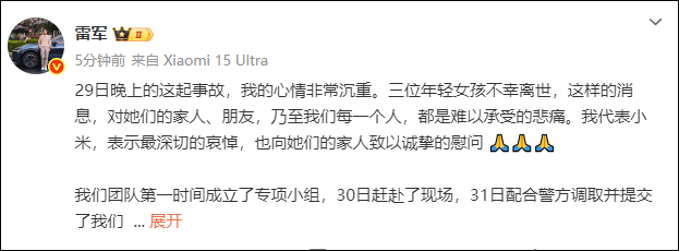 29日晚上的这起事故,我的心情非常沉重。三位年轻女孩不幸离世,这样的消息,对她们的家人、朋友,乃至我们每一个人,都是难以承受的悲痛。我代表小米,表示最深切的哀悼,也向她们的家人致以诚挚的慰问。