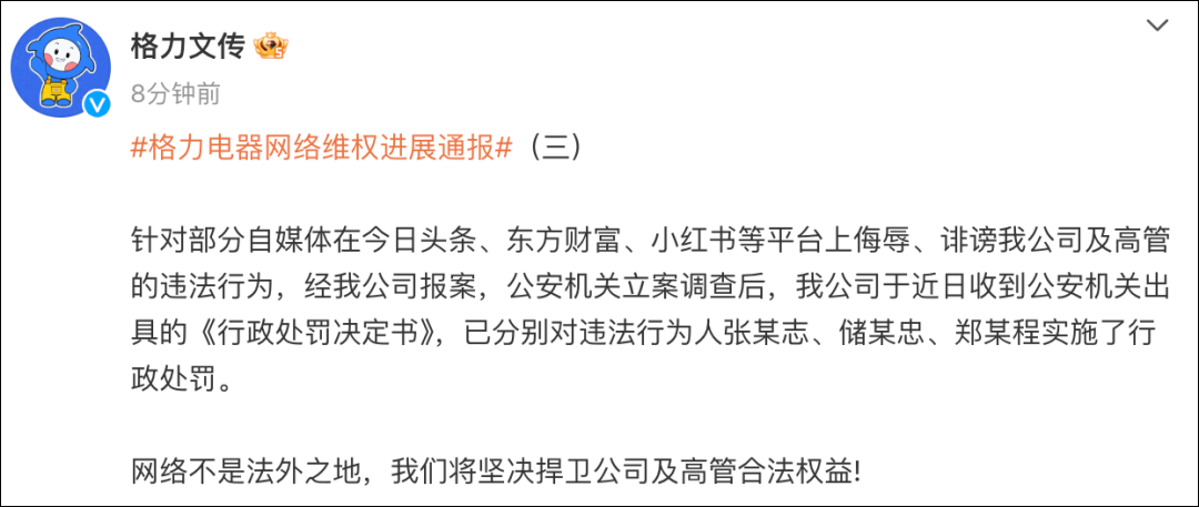 格力表示,针对部分自媒体在今日头条、东方财富、小红书等平台上侮辱、诽谤我公司及高管的违法行为,经我公司报案,公安机关立案调查后,我公司于近日收到公安机关出具的《行政处罚决定书》,已分别对违法行为人张某志、储某忠、郑某程实施了行政处罚。