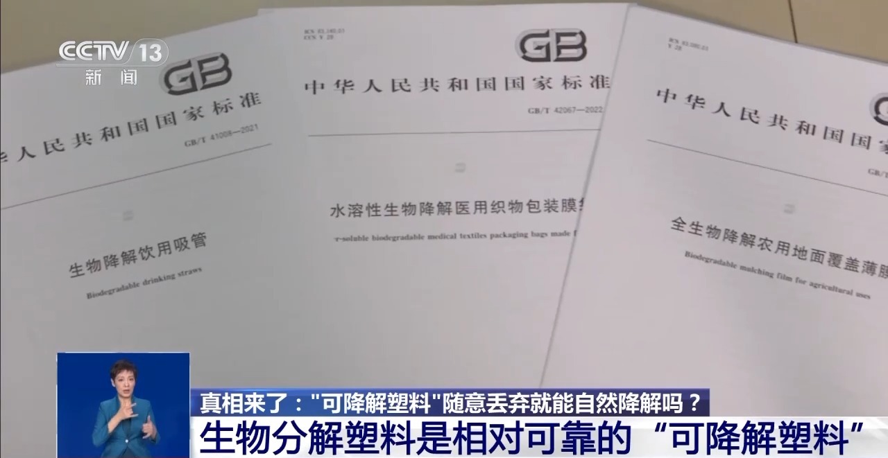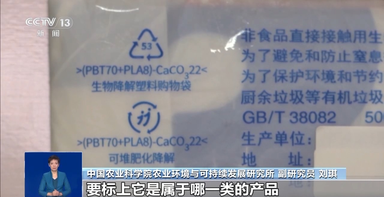 中国农业科学院农业环境与可持续发展研究所 副研究员刘琪:在这项国标当中,对生物降解制品是有要求的。它有一个标识,在这个标识当中,我们要介绍它是由哪些聚酯或其他材料、哪些组分所组成的。第二个就要标清楚它是在什么条件下,比如土壤当中或者是堆肥的条件下就能降解,还是在什么特殊的条件下才能降解。第三个就是它是符合哪一类国标的产品,是符合吸管类的,还是一次性包装的,还是购物袋的,还是农用地膜的,要标上它是属于哪一类的产品。