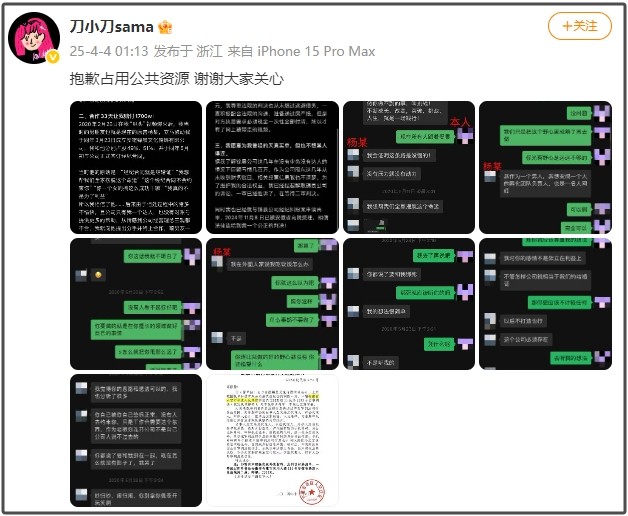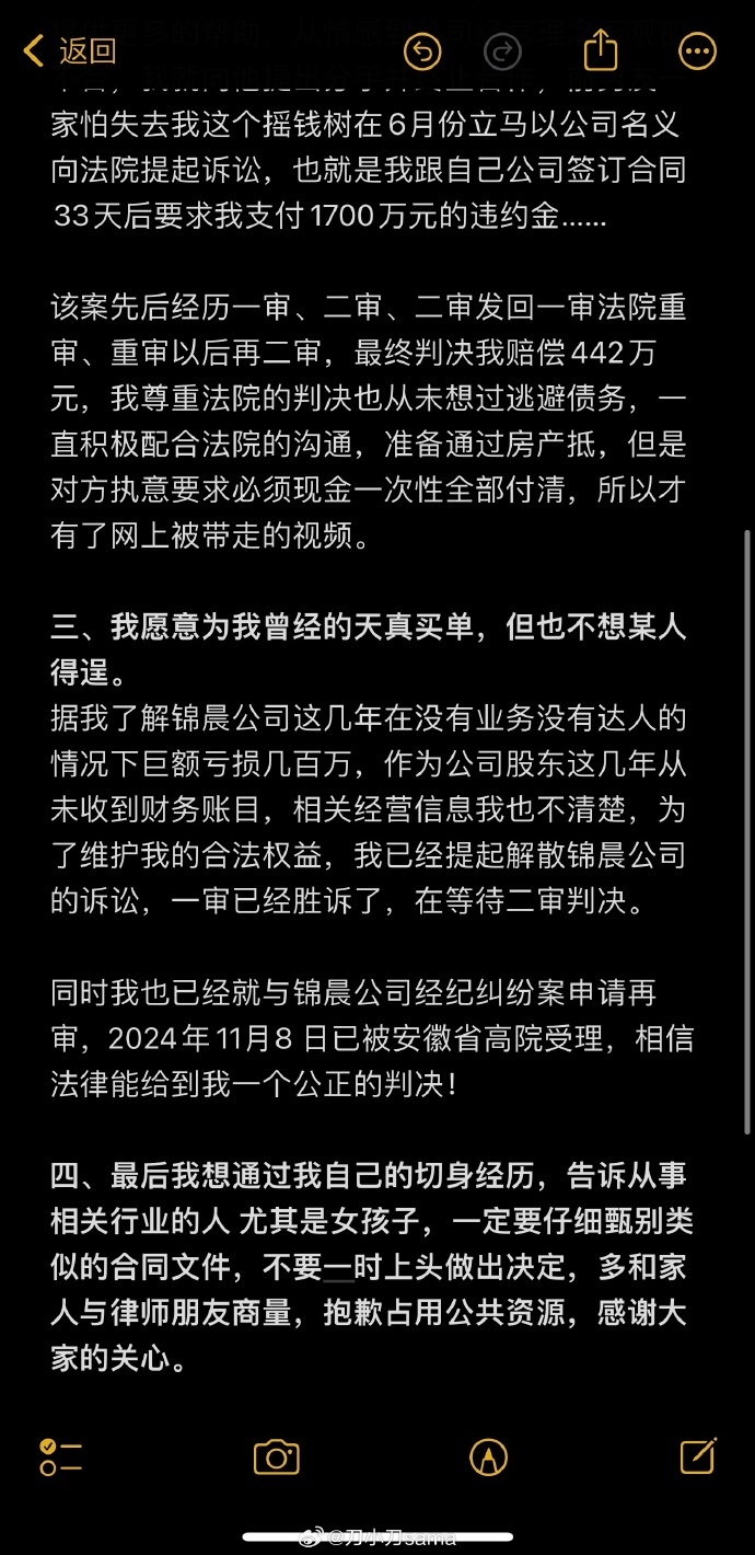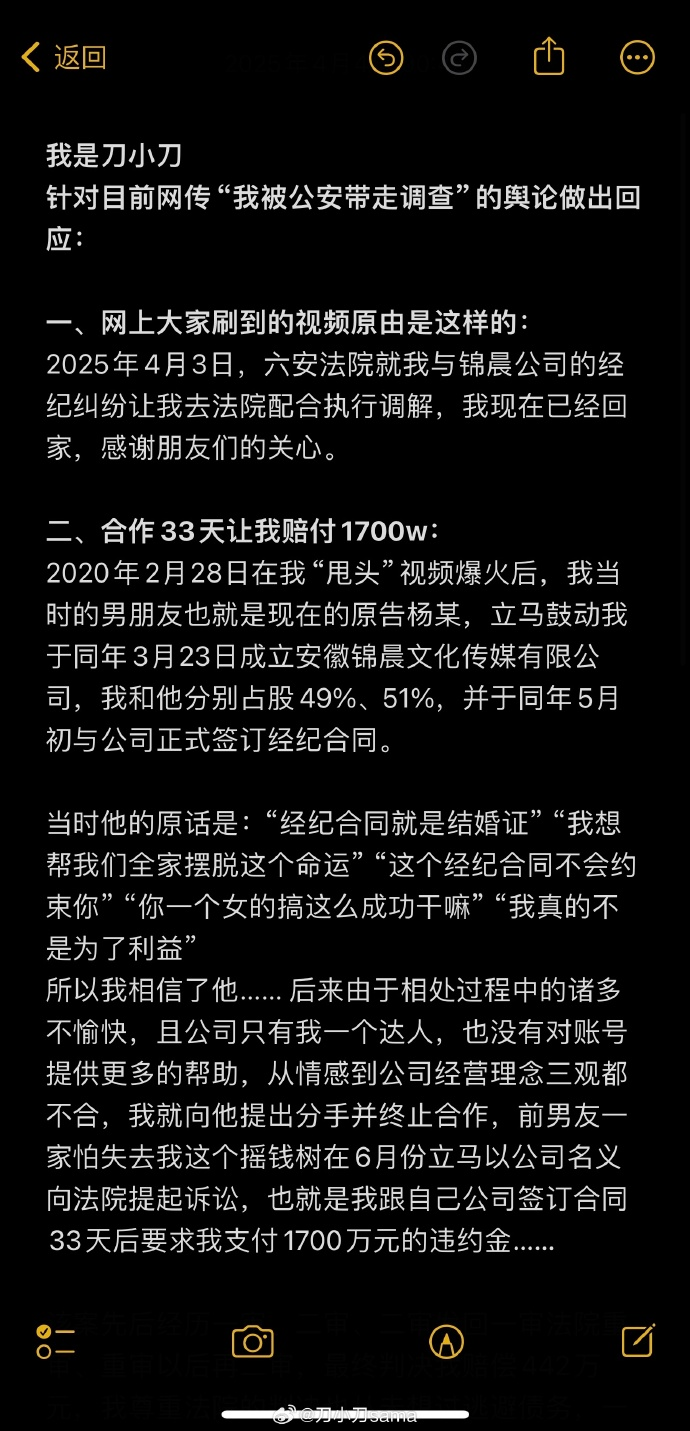 4月4日凌晨,“刀小刀”发文称,她是去法院配合调解执行她与锦晨公司的经纪合同纠纷,现已回家。