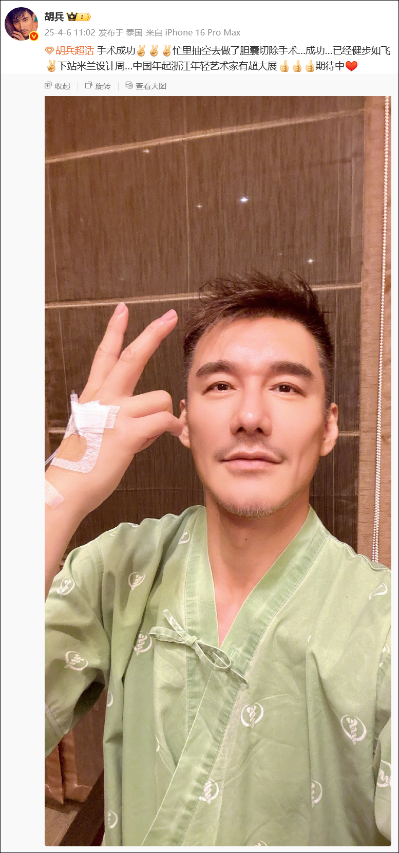 4月6日,胡兵就在社交平台分享了自己手术的消息:“手术成功!忙里抽空去做了胆囊切除手术,已经健步如飞,下站米兰设计周。”
