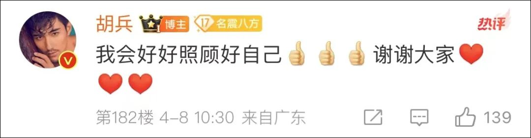 胡兵还在评论区感谢各位关心他的网友:“我会好好照顾好自己,谢谢大家。”