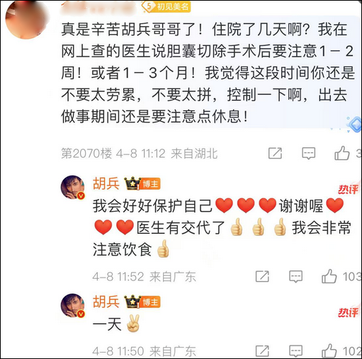 还有网友询问手术具体情况,胡兵透露自己住院了一天,医生有交代术后注意事项,自己会非常注意饮食。