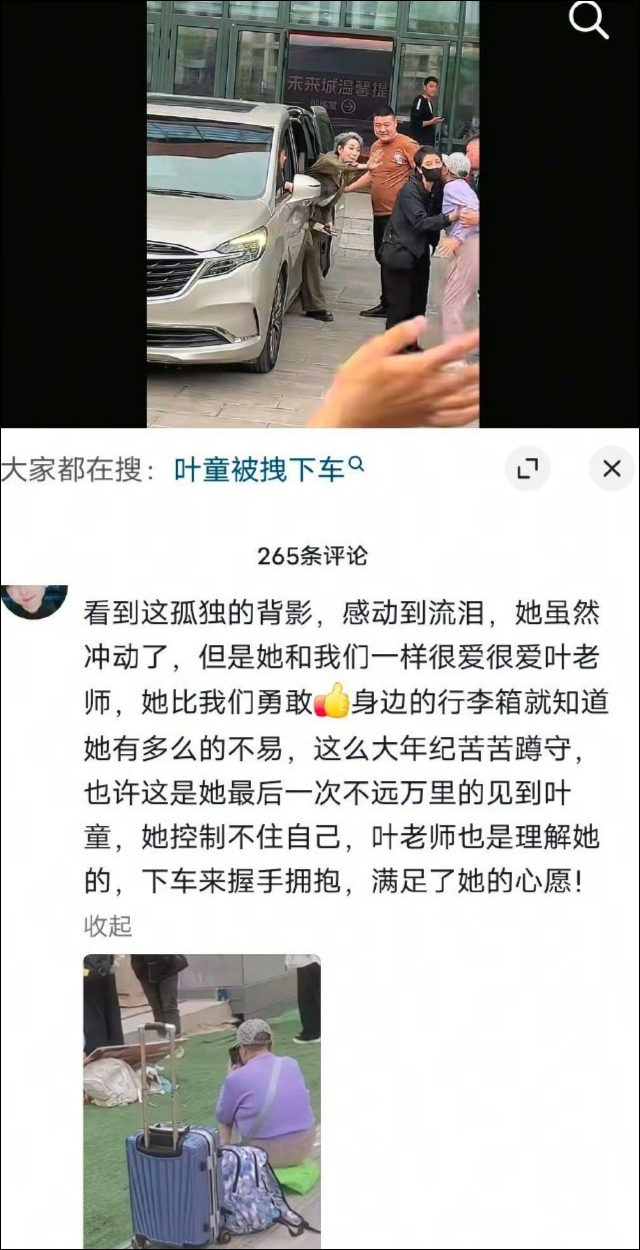 4月15日,女演员叶童结束活动准备上车离开,一粉丝突破安保冲到叶童车前,疑似拽着叶童下车不让走。叶童下车拥抱她,嘴里还不停地说着“谢谢”。两位工作人员拽了好久才把这位粉丝带离。