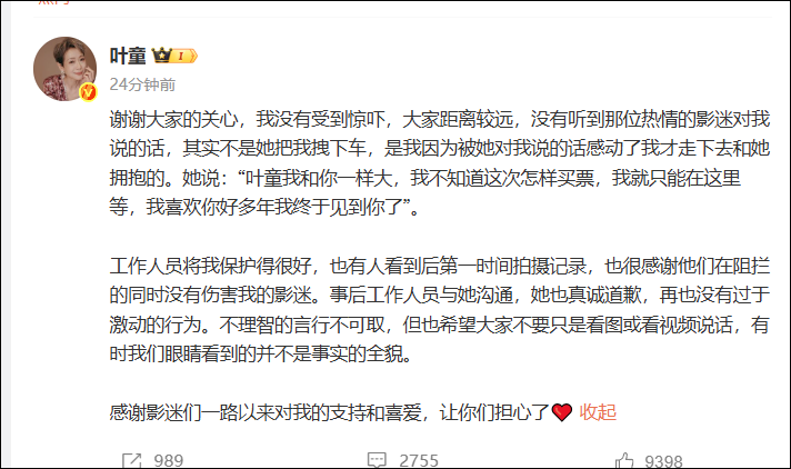 谢谢大家的关心,我没有受到惊吓,大家距离较远,没有听到那位热情的影迷对我说的话,其实不是她把我拽下车,是我因为被她对我说的话感动了我才走下去和她拥抱的。她说:“叶童我和你一样大,我不知道这次怎样买票,我就只能在这里等,我喜欢你好多年我终于见到你了”。