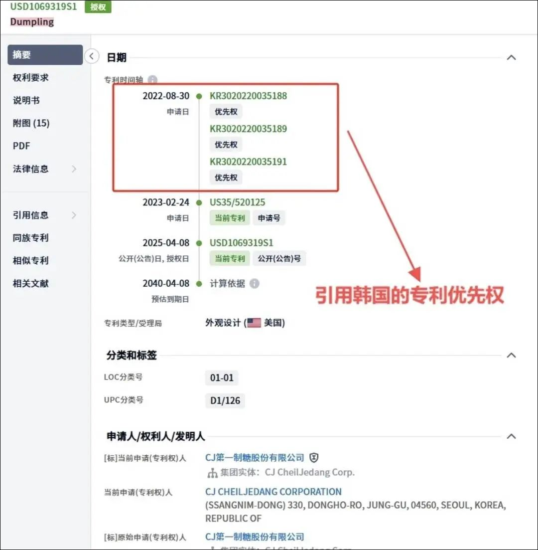 16日,记者查询相关文件发现,饺子外观专利的申请日期为2023年2月24日,下证日期为2025年4月8日,注册人是韩国CJ第一制糖股份有限公司,专利保护期限是15年。记者查阅发现,其申请的饺子外形,和我国的饺子高度相似。