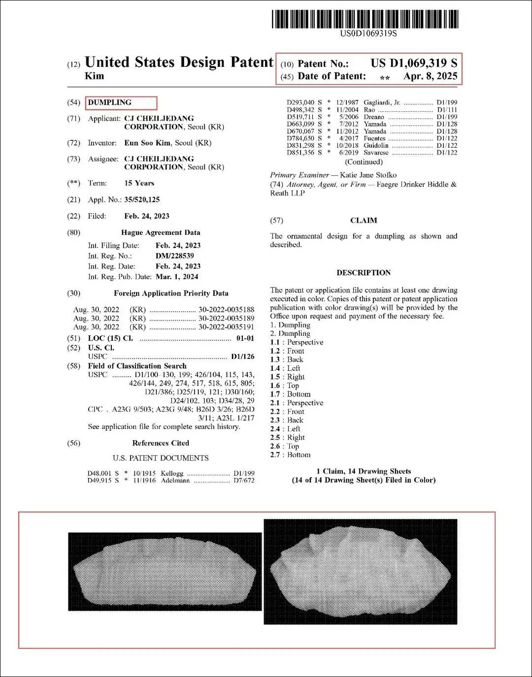美国专利商标局官网显示,近日,韩国CJ第一制糖股份有限公司(下称“CJ公司”)在美国注册的饺子外观专利,获准通过。