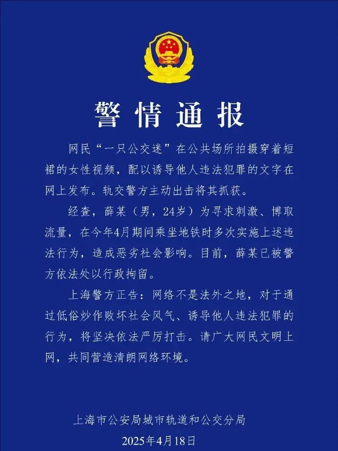 刚刚,上海市公安局城市轨道和公交分局微博@轨交幺幺零发布警情通报:网民“一只公交迷”在公共场所拍摄穿着短裙的女性视频,配以诱导他人违法犯罪的文字在网上发布。轨交警方主动出击将其抓获。经查,薛某(男,24岁)为寻求刺激、博取流量,在今年4月期间乘坐地铁时多次实施上述违法行为,造成恶劣社会影响。目前,薛某已被警方依法处以行政拘留。