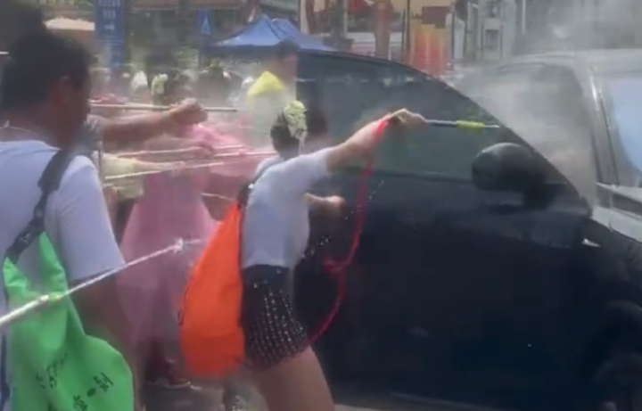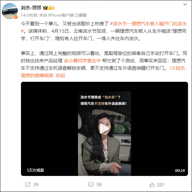 视频显示,4月15日,在云南泼水节活动现场,一辆理想汽车被人从车外喊话“理想同学,打开车门”,随后车门被拉开,车内被泼入大量水,成“泡水车”。