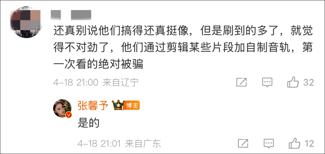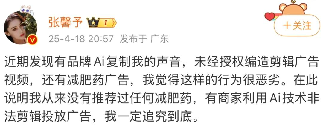 4月18日晚,演员张馨予发文:近期发现有品牌AI复制我的声音,未经授权编造剪辑广告视频,还有减肥药广告,我觉得这样的行为很恶劣。在此说明我从来没有推荐过任何减肥药,有商家利用AI技术非法剪辑投放广告,我一定追究到底。