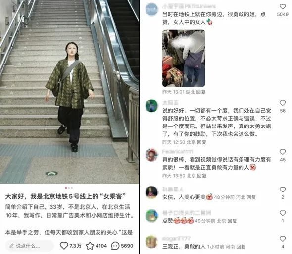 4月22日,这名挺身而出的女子首次通过社交媒体发文《大家好,我是北京地铁5号线上的“女乘客”》。在文章中,她表示,当天因朋友临时赠票改乘地铁,自己只是“碰巧在那个地点那个时间,说了大家想说却没说的话”。她还说,地铁上的冲突是极个别现象,大部分乘客都很友好。