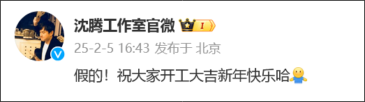 沈腾工作室发回应辟谣:“假的!祝大家开工大吉新年快乐哈。”