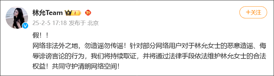 林允工作室也发文辟谣:“假!!网络非法外之地,勿造谣勿传谣!针对部分网络用户对于林允女士的恶意造谣、侮辱诽谤言论的行为,我们将持续取证,并将通过法律手段依法维护林允女士的合法权益!共同守护清朗网络空间!”