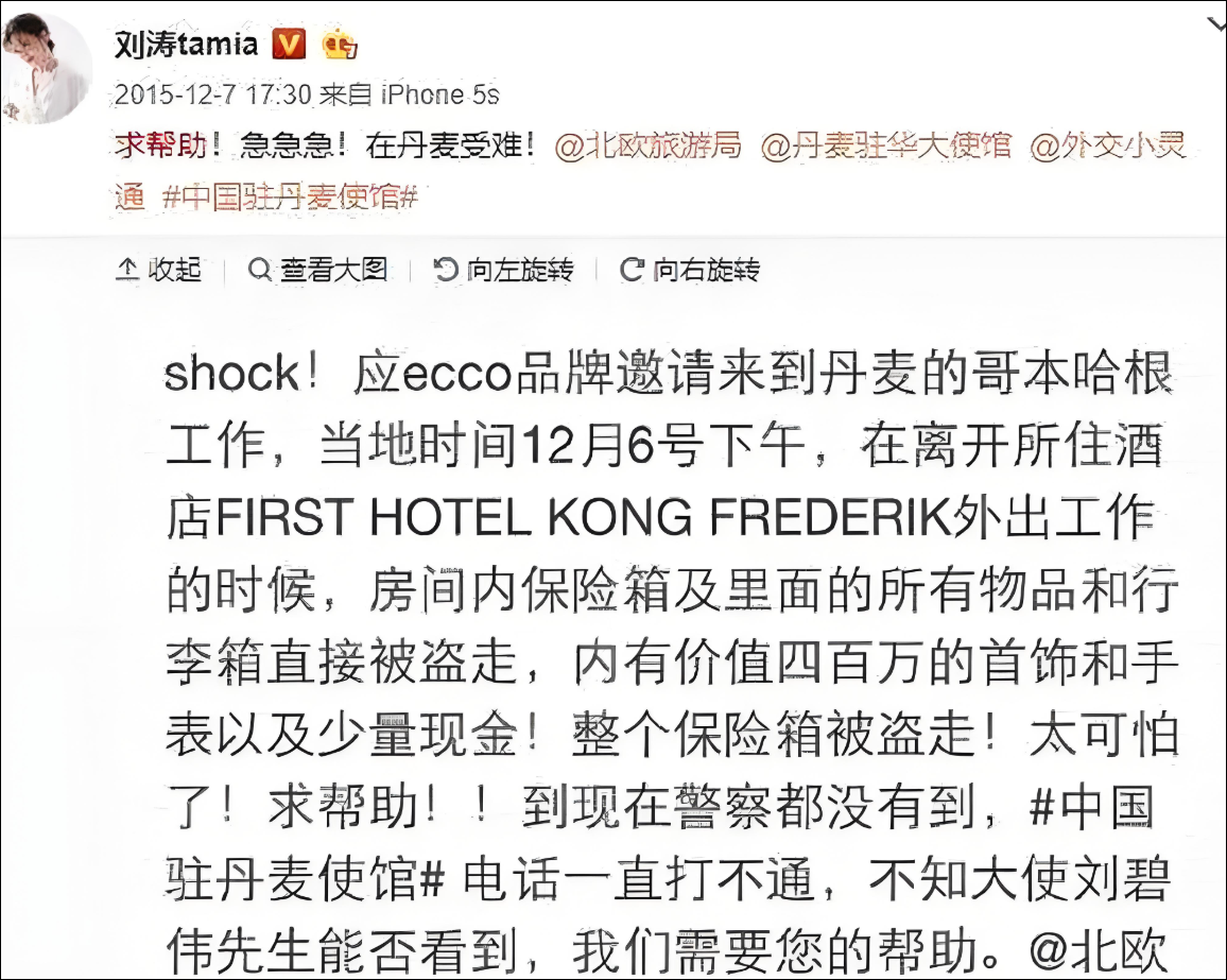 早在2015年,刘涛在丹麦酒店遭遇盗窃,保险箱400万首饰被盗,经网络求助破案。