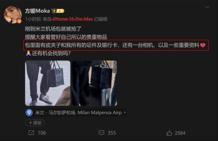 27日晚,方媛在社媒再次发文回应此事,表示事情发生后,已及时报警及寻求中国驻米兰大使馆协助,大使馆的工作人员效率十分高,迅速处理,“也让我感受到了祖国的温暖!”