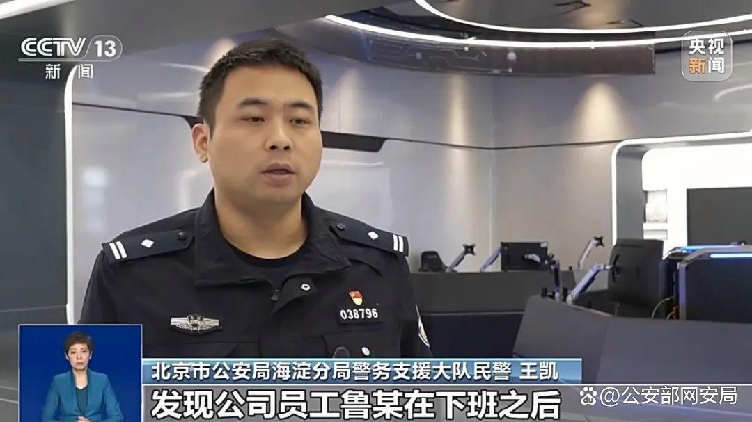 北京市公安局海淀分局警务支援大队民警 王凯:公司调取监控录像,发现公司员工鲁某在下班之后,并没有离开工区,并在多个工位内逗留,疑似向公司的办公电脑插入U盘等外接设备。他们公司有一个负责网络安全的员工,电脑启动之后,就发现进程里边跑了很多未知的进程,疑似是木马进程。