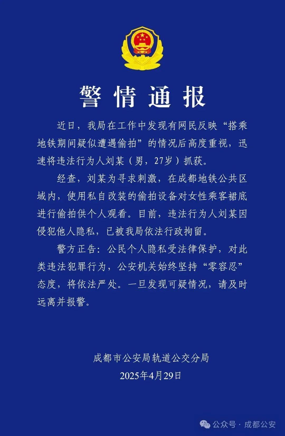 (原标题:女子身着裙子乘地铁疑遭偷拍 成都警方:属实,已拘!)