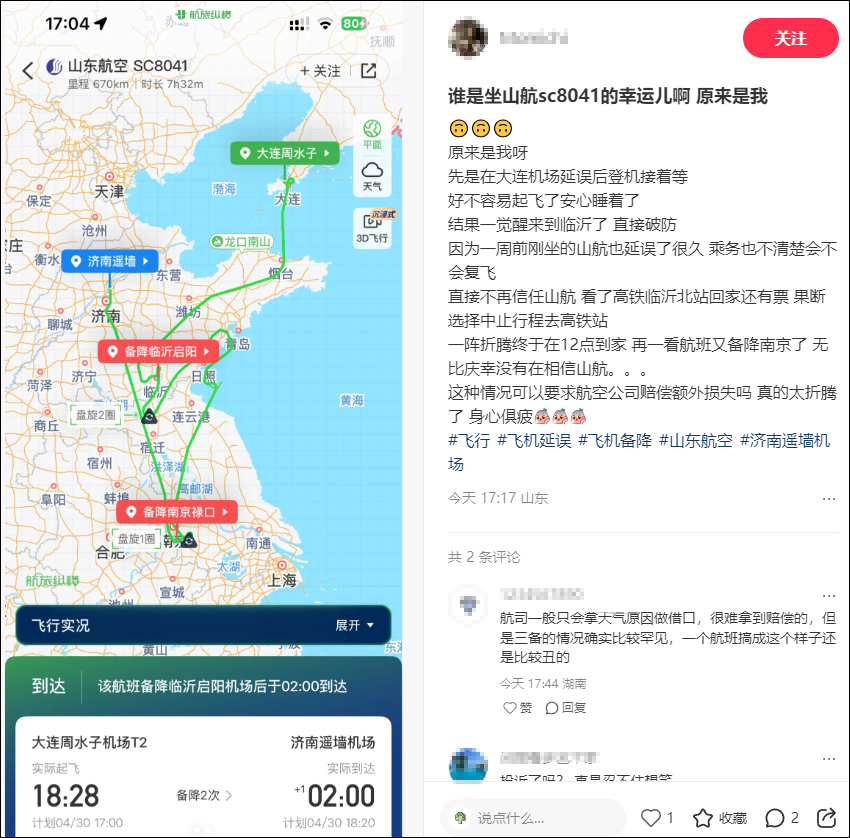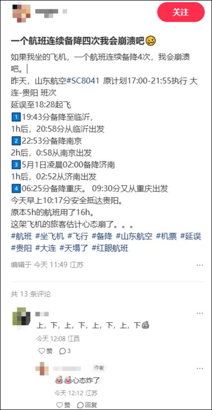 都市快报综合 今天,有多位网友发帖称:一趟原定于4月30日下午5点从大连起飞,当晚9点55分抵达贵阳的山东航空航班出现数次备降,最后于今天上午10点多才降落贵阳。