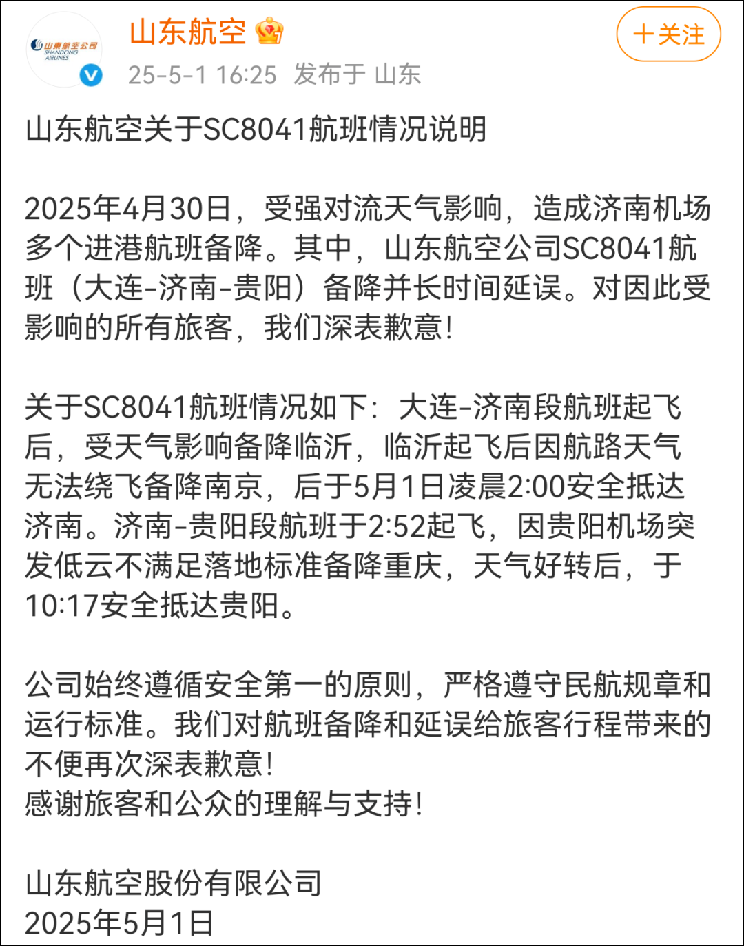 关于SC8041航班情况如下:大连-济南段航班起飞后,受天气影响备降临沂,临沂起飞后因航路天气无法绕飞备降南京,后于5月1日凌晨2:00安全抵达济南。济南-贵阳段航班于2:52起飞,因贵阳机场突发低云不满足落地标准备降重庆,天气好转后,于10:17安全抵达贵阳。