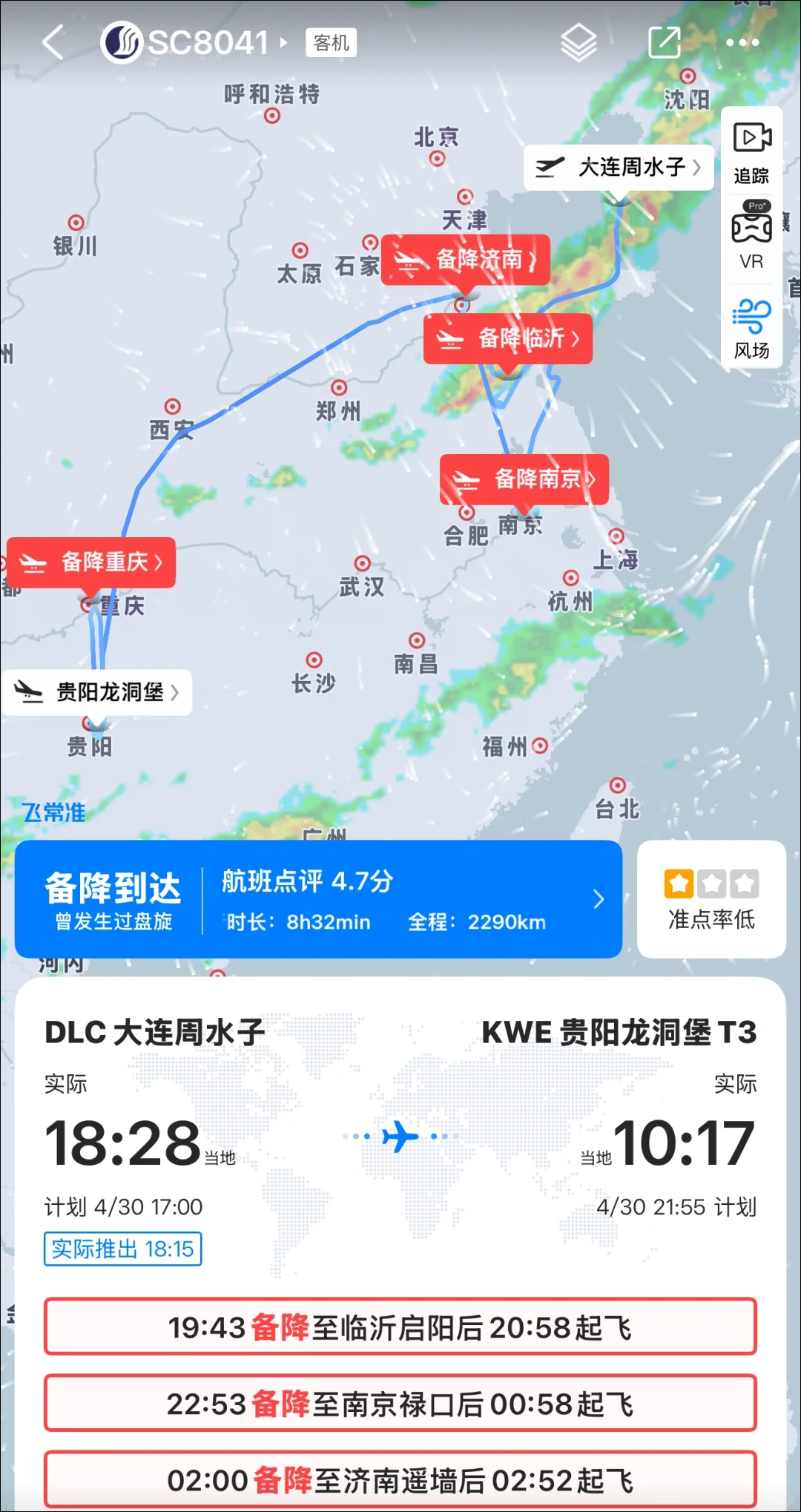 据该航班信息,该SC8041航班原计划从大连周水子机场出发,经停济南遥墙机场,最后抵达贵阳龙洞堡机场。途中却备降临沂启阳、南京禄口、重庆江北等多地。
