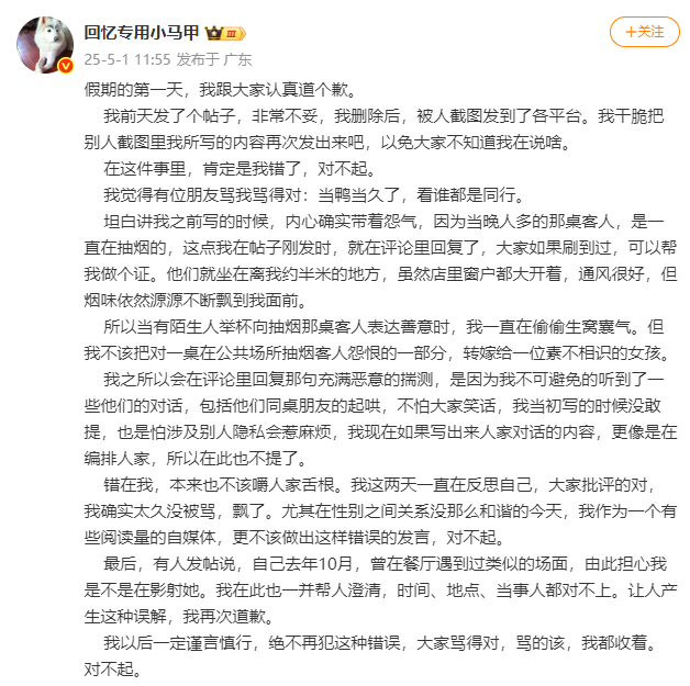 5月1日,千万粉丝网红“回忆专用小马甲”道歉。