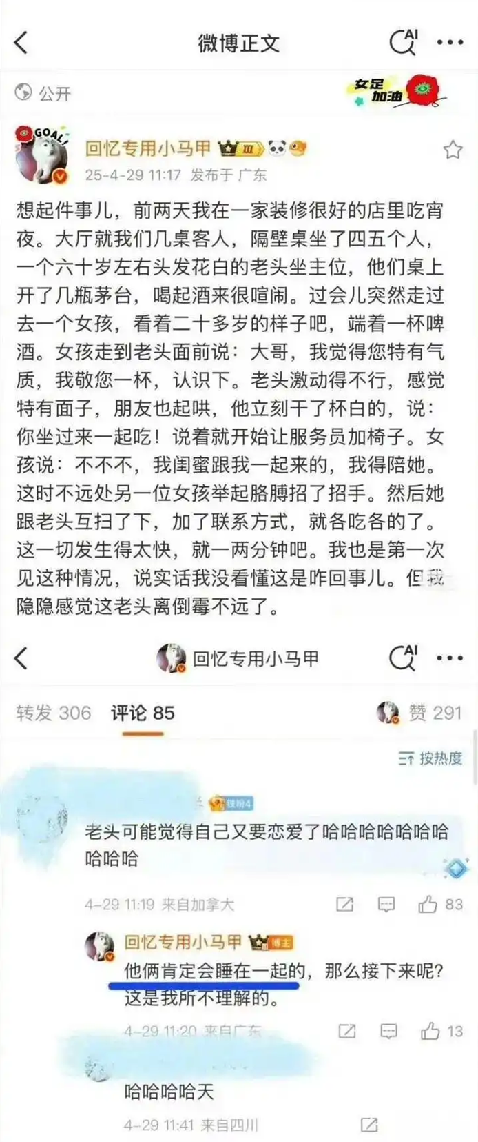 4月29日,“回忆专用小马甲”发文称目睹一年轻