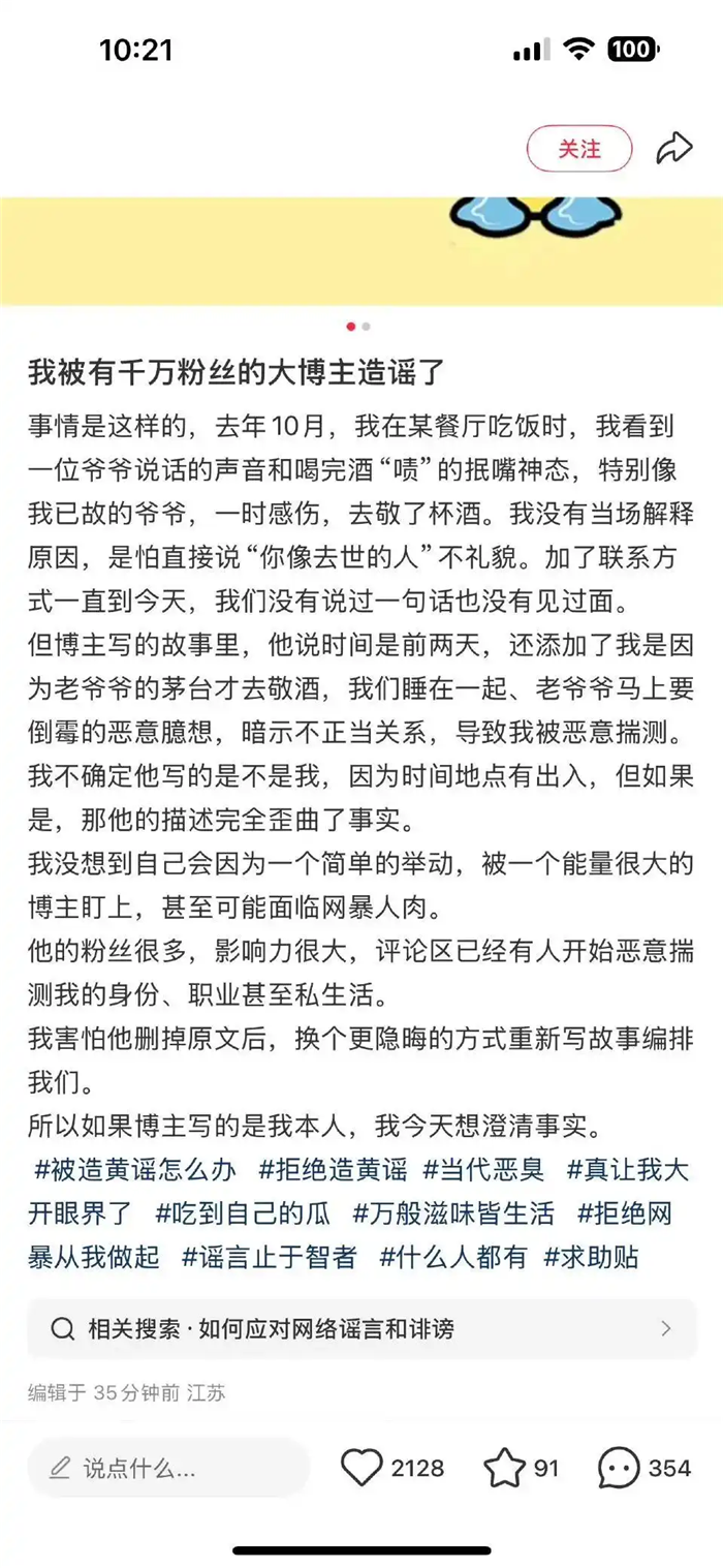 之后,有网友发文称自己被“回忆专用小马甲”造谣。该网友称自己是看到老人声音、神态像自己已故的爷爷,才去敬了酒。