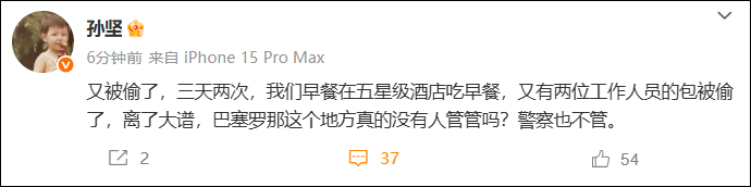 4月24日,孙坚发视频称自己“又被偷了”:“又丢了,三天两次,这是一个什么地方啊,我们还在五星级酒店吃早餐。”